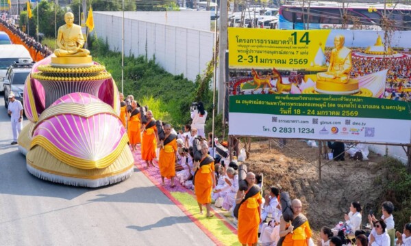 ขอเรียนเชิญพุทธศาสนิกชนทุกท่านสร้างมหากุศล ร่วมโปรยกลีบดอกเบญจทรัพย์และทรัพย์บานชื่นในพิธีต้อนรับพระธรรมยาตรากลับสู่วัดพระธรรมกาย จ.ปทุมธานี ในวันอาทิตย์ที่ 25 มกราคม 2569 รอบที่ 1 รร.สามัคคีราษฎร์บำรุง สู่อาคารโถงช้าง เริ่มเดิน 10.00 น. ระยะทาง 6.17 กม. และรอบที่ 2 อาคารโถงช้าง-มหาธรรมกายเจดีย์ เริ่มเดิน 14.30 น. ระยะทาง 4.70 กม. โครงการดังกล่าวนี้จัดขึ้นโดยเครือข่ายคณะศิษยานุศิษย์วัดพระธรรมกายทั่วโลก ร่วมกับองค์การพุทธโลก (พล) วัดพระธรรมกาย มูลนิธิธรรมกาย และภาคีเครือข่ายชาวพุทธกว่า 20 องค์กรจากนานาประเทศ สามารถติดตามข่าวสารได้ทางเว็บไซต์ www.gbnus.com และเฟซบุ๊กแฟนเพจ “สำนักสื่อสารองค์กร วัดพระธรรมกาย” หรือสอบถามเพิ่มเติมได้ที่โทรศัพท์ 0-2831-1234