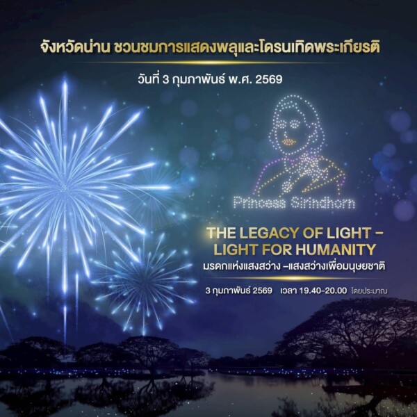 จังหวัดน่านขอเชิญประชาชนร่วมชมการแสดง พลุและโดรนเทิดพระเกียรติ ระหว่างวันที่ 3–4 กุมภาพันธ์ 2569 เพื่อเฉลิมพระเกียรติและต้อนรับการเสด็จพระราชดำเนิน ณ จังหวัดน่าน ของ สมเด็จพระกนิษฐาธิราชเจ้า กรมสมเด็จพระเทพรัตนราชสุดาฯ สยามบรมราชกุมารี ถ่ายทอดเรื่องราว “แสงแห่งปัญญา ความหวัง และมนุษยธรรม” ควบคู่เสน่ห์เมืองน่าน ผ่านศิลปะบนท้องฟ้าอย่างงดงาม ณ บริเวณ หนองน้ำครก