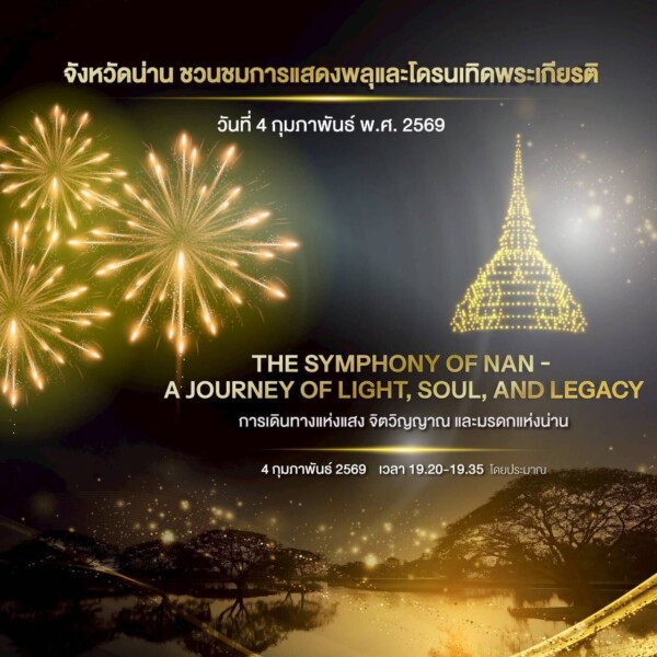 จังหวัดน่านขอเชิญประชาชนร่วมชมการแสดง พลุและโดรนเทิดพระเกียรติ ระหว่างวันที่ 3–4 กุมภาพันธ์ 2569 เพื่อเฉลิมพระเกียรติและต้อนรับการเสด็จพระราชดำเนิน ณ จังหวัดน่าน ของ สมเด็จพระกนิษฐาธิราชเจ้า กรมสมเด็จพระเทพรัตนราชสุดาฯ สยามบรมราชกุมารี ถ่ายทอดเรื่องราว “แสงแห่งปัญญา ความหวัง และมนุษยธรรม” ควบคู่เสน่ห์เมืองน่าน ผ่านศิลปะบนท้องฟ้าอย่างงดงาม ณ บริเวณ หนองน้ำครก
