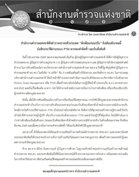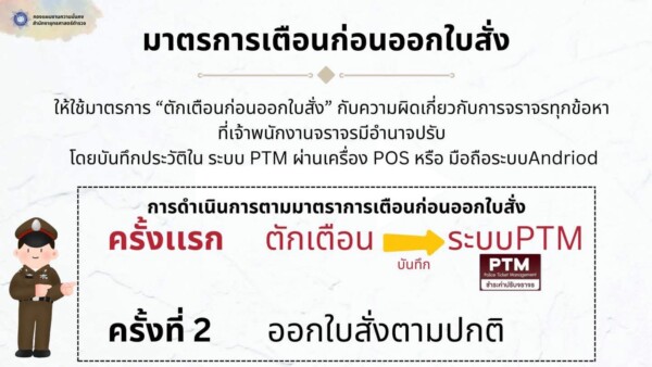 ดังนั้น เพื่อให้การขับเคลื่อนนโยบายด้านการป้องกันอุบัติเหตุทางถนน การบังคับใช้กฎหมายจราจรของสำนักงานตำรวจแห่งชาติ เกี่ยวกับการว่ากล่าวตักเตือนประชาชนก่อนออกใบสั่งทุกข้อหาที่เจ้าพนักงานจราจรมีอำนาจปรับ โดยมีการบันทึกประวัติผ่านระบบ PTM เป็นไปอย่างมีประสิทธิภาพ จึงสั่งการให้ทุกหน่วยสร้างความรู้ความเข้าใจกับเจ้าหน้าที่ตำรวจจราจรผู้ปฏิบัติ เกี่ยวกับการออกใบสั่งผ่านระบบ PTM และนำไปปฏิบัติให้ถูกต้อง โดยให้ดำเนินการว่ากล่าวตักเตือนเป็นอันดับแรก ก่อนออกใบสั่งทุกข้อหาที่เจ้าพนักงานจราจรมีอำนาจปรับ ในห้วงเดือนมกราคม ถึงเดือนมีนาคม 2569 และเมื่อพบว่าเป็นการกระทำความผิดซ้ำ ให้ออกใบสั่งบังคับใช้กฎหมายตามปกติ