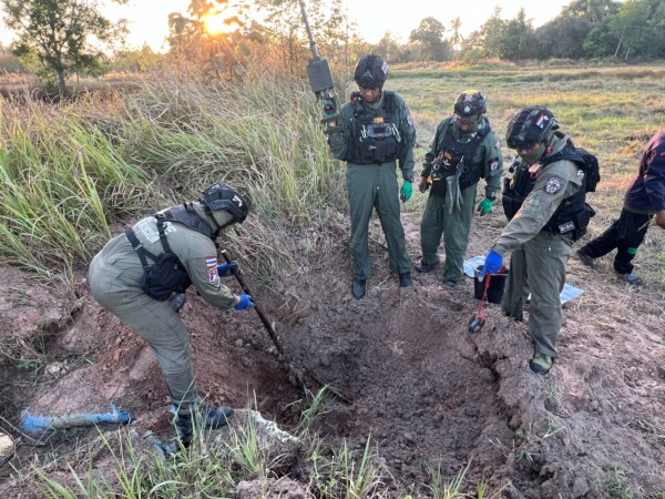 เมื่อวันที่ 31 ม.ค.69 ที่บ้านโนนสว่าง หมู่ 5 ต.เสาธงชัย อ.กันทรลักษ์ จ.ศรีสะเกษ ร.ต.อ.ธีรภัทร นามมั่น หัวหน้าชุด เก็บกู้และทำลายวัตถุระเบิด (EOD กก.ตชด.22) ได้นำเจ้าหน้าที่ EOD จังหวัดศรีสะเกษ เร่งเก็บกู้เเละทำลายวัตถุระเบิดตามแนวชายแดนเขาพระวิหาร หลังได้รับแจ้งจากชาวบ้านว่าพบระเบิดตกอยู่ในทุ่งนาบ้านโนนสว่าง หมู่ 5 ต.เสาธงชัย โดยเมื่อเจ้าหน้าที่เดินทางมาถึงก็ได้มีการตรวจสอบวัตถุระเบิดดังกล่าว พบว่า เป็นลูกกระสุนปืนใหญ่ ขนาด 105 มม. และระเบิดยังทำงานไม่สมบูรณ์ เจ้าหน้าที่จึงได้ขุดระเบิดออก เพื่อนำไปทำลาย และอีกจุดหนึ่งพบที่หลุมเดิมตัวบูสเตอร์ตัวเร่งปฏิกิริยาการระเบิด หลุดออกจากระเบิด เจ้าหน้าที่จึงได้มีการเก็บไปทำลายพร้อมกันด้วย