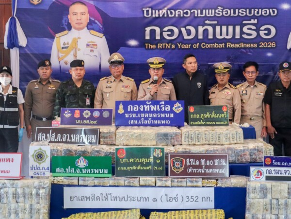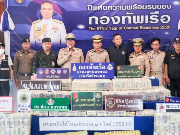 ผู้สื่อข่าวรายงานว่า วันที่ 5 ก.พ.69 เวลา 08.30 น. พล.ร.ต.ณรงค์ เอมดี ผบ.นรข. พร้อมด้วย ว่าที่พันตรี อดิศักดิ์ น้อยสุวรรณ ผวจ.นครพนม เป็นประธานร่วมแถลงข่าวกรณี สน.เรือบ้านแพง ตรวจยึดของกลางยาเสพติดให้โทษประเภท 1 (ไอซ์) จำนวน 352 กก. บริเวณเล้าไก่ ริมฝั่งแม่น้ำโขง บ.นาเขท่า หมู่ 3 ต.นาเข อ.บ้านแพง จ.นครพนม ณ สโมสรสัญญาบัตร บก.นรข. อ.เมืองนครพนม จ.นครพนม โดยมี น.อ.แมนรัตน์ บุญสวัสดิ์ ผบ.นรข.เขตนครพนม และหน่วยงานที่เกี่ยวข้องร่วมแถลงข่าว