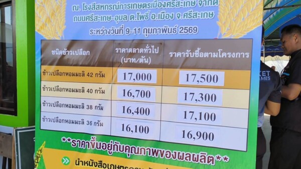 สำหรับการจัดกิจกรรมในครั้งที่ 2 นี้ กำหนดจัดขึ้นระหว่างวันที่ 9-11 ก.พ. 2569 ที่โรงสีสหกรณ์การเกษตรเมืองศรีสะเกษ จำกัด เปิดรับซื้อข้าวเปลือกจากเกษตรกรในราคากิโลกรัมละ 17.50 บาท ซึ่งสูงกว่าราคารับซื้อในท้องตลาดทั่วไปในขณะนี้ ส่งผลทำให้เกษตรกรแห่นำข้าวเปลือกออกมาขายเป็นจำนวนมาก โดยโครงการดังกล่าวเป็นการบูรณาการความร่วมมือระหว่าง สำนักงานพาณิชย์จังหวัดศรีสะเกษ สำนักงานสหกรณ์จังหวัดศรีสะเกษ และสหกรณ์การเกษตรเมืองศรีสะเกษ จำกัด โดยยังคงมุ่งเน้นการเชื่อมโยงการซื้อขายข้าวเปลือกระหว่างเกษตรกรและผู้ประกอบการโดยตรง เพื่อเพิ่มทางเลือกและเสริมสร้างอำนาจต่อรองให้แก่เกษตรกร ส่งเสริมให้การซื้อขายข้าวเปลือกเป็นไปอย่างโปร่งใส เป็นธรรม ทั้งด้านราคา การชั่งน้ำหนัก และการตรวจสอบคุณภาพข้าวเปลือก ซึ่งสอดคล้องกับนโยบายรัฐบาล ในการดูแลรายได้เกษตรกร และการรักษาเสถียรภาพราคาข้าวเปลือกในประเทศอย่างยั่งยืน.