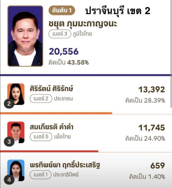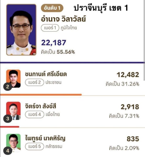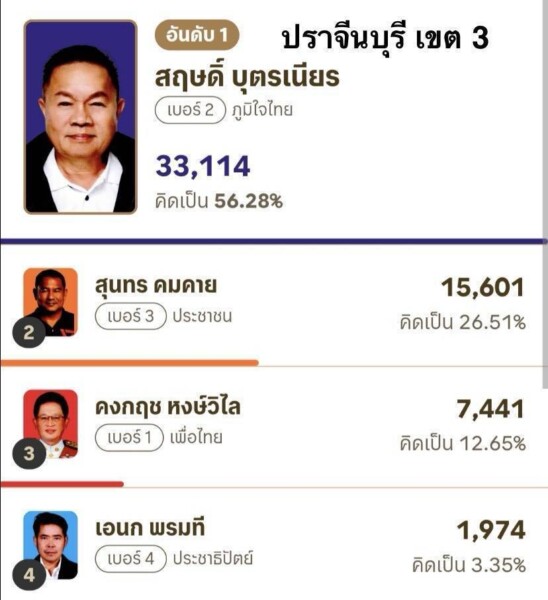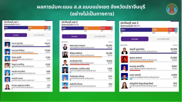 ผลการนับคะแนน ส.ส.แบบแบ่งเขต จังหวัดปราจีนบุรี (อย่างไม่เป็นทางการ)จำนวน 3 เขต ดังนี้