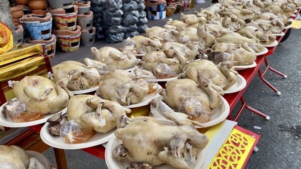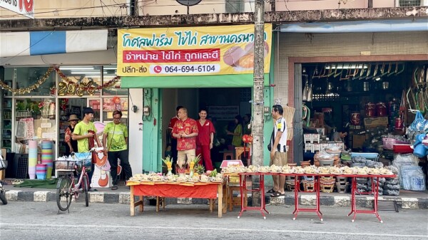 ที่บริเวณร้านโกศลฟาร์มไข่ไก่ สาขานครนายก ถ.พาณิชย์เจริญ ต.นครนายก อ.เมือง จ.นครนายก นายกฤติน อุดมศิริ อายุ 38 ปี และนางสาวณัฏฐ์ชานันท์ ราชนาทิพย์ อายุ 35 ปี สามี-ภรรยา เจ้าของร้าน ได้จัดตั้งโต๊ะหน้าร้านไหว้ตรุษจีน ซึ่งมีของเซ่นไหว้เป็นผลไม้ ขนมเข่ง ขนมเทียน และไก่ต้มจำนวน 100 ตัว ไหว้สิ่งศักดิ์สิทธิ์และขอพร เสริมสิริมงคลในปีม้าทอง การค้าขายดีมีความเจริญรุ่งเรือง ประสบความสำเร็จในวันตรุษจีน หลังจากไหว้เสร็จพนักงานในร้านก็ช่วยกันสับไก่ต้มใส่กล่อง แล้วแจกให้กับประชาชนที่มารับและที่สัญจรไปมาก็แวะรับไก่ต้มคนละ 1 กล่องจากเจ้าของร้าน