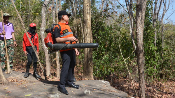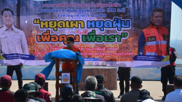 มุกดาหาร/เมื่อวันที่ 19 กุมภาพันธ์ 2569 ที่บริเวณภูมโนรมย์รอบวัดพระพุทธบาทภูมโนรมย์ จังหวัดมุกดาหาร นายวรญาณ บุญณราช ผู้ว่าราชการจังหวัดมุกดาหารเปิดกิจกรรมการจัดทำแนวกันไฟป้องกันและแก้ไขปัญหาไฟป่า หมอกควัน และฝุ่นละอองขนาดเล็ก (PM2.5) โดยมีหัวหน้าส่วนราชการ สำนักงานป้องกันและบรรเทาสาธารณภัยจังหวัดมุกดาหาร หน่วยงานสังกัดกรมอุทยานแห่งชาติสัตว์ป่าและพันธ์พืช หน่วยงานอื่น ๆ ที่เกี่ยวข้อง ราษฎรจิตอาสาจากภาคีเครือข่ายต่างๆ ร่วมทำแนวกันไฟรอบบริเวณ วัดรอยพระพุทธบาทภูมโนรมย์ เขตอุทยานภูผาเทิบ-ภูผายล รวมระยะทาง 1,500 เมตร