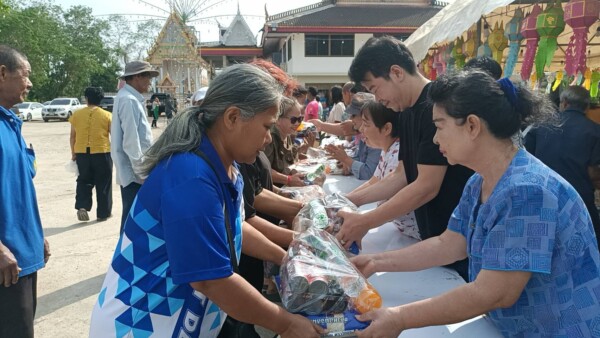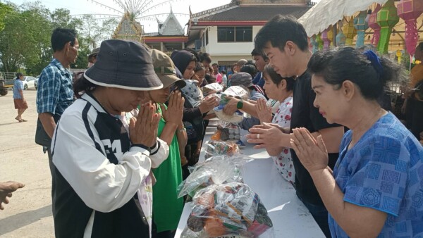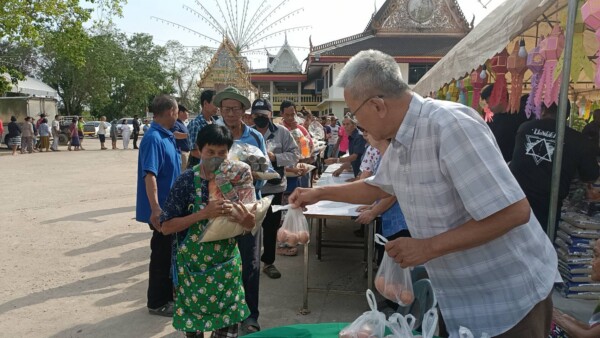 ต่อมาในเช้าวันที่ 20 กุมภาพันธ์ ทางคณะเจ้าภาพได้ร่วมกันถวายภัตตาหารเช้าแด่พระภิกษุสงฆ์จำนวน 9 รูป ก่อนจะเข้าสู่พิธีการแจกทานแก่ประชาชนทั่วไป โดยมีการแจกบัตรคิวเพื่อมอบ ข้าวสาร (ถุงละ 3 กก.) และถุงยังชีพรวมกว่า 400 ชุด ภายในถุงประกอบด้วยสิ่งของจำเป็น อาทิ บะหมี่กึ่งสำเร็จรูป ไข่ไก่ น้ำมันพืช และไข่ต้ม เพื่อบรรเทาภาระค่าครองชีพให้แก่ชาวบ้านในละแวกใกล้เคียง