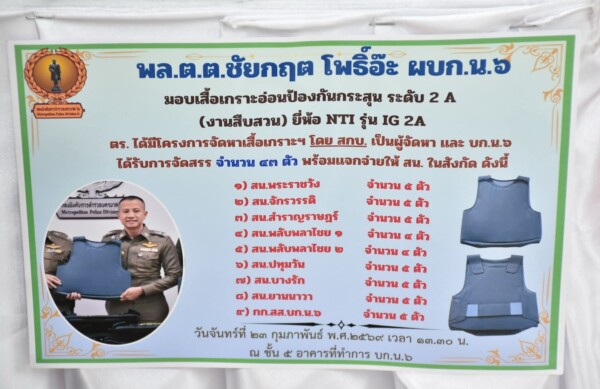 งานสืบสวน: เสื้อเกราะอ่อนป้องกันกระสุน ระดับ 2A (ยี่ห้อ NTI รุ่น IG 2A) จำนวน 43 ตัว