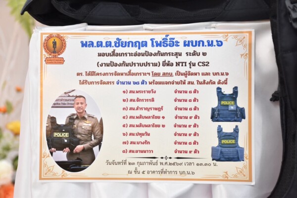 “การมอบเสื้อเกราะในครั้งนี้ มุ่งเน้นไปที่การเพิ่มประสิทธิภาพในการเข้าระงับเหตุและการปฏิบัติหน้าที่ในพื้นที่เสี่ยงภัย เพื่อให้มั่นใจว่าข้าราชการตำรวจทุกนายจะมีอุปกรณ์ป้องกันตัวที่ทันสมัยและปลอดภัยที่สุดขณะดูแลความสงบสุขของประชาชน”