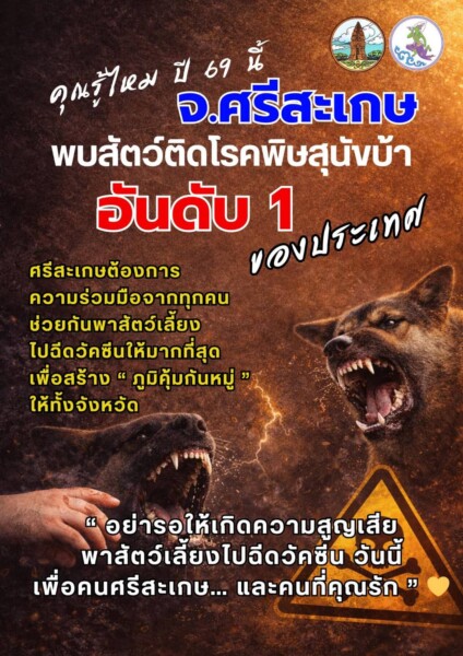 ทั้งนี้โรคพิษสุนัขบ้า เป็นโรคติดต่อจากสัตว์สู่คนที่มีความรุนแรงสูง เมื่อแสดงอาการแล้วมีอัตราการเสียชีวิตเกือบ 100% แต่สามารถป้องกันได้ด้วยการฉีดวัคซีนในสัตว์เลี้ยงอย่างสม่ำเสมอ และการปฏิบัติตนอย่างถูกต้องเมื่อถูกสัตว์กัดหรือข่วน ดังนั้น จ.ศรีสะเกษ จึงมุ่งมั่นขับเคลื่อนมาตรการเชิงรุก ทั้งด้านการเฝ้าระวัง การฉีดวัคซีน การควบคุมประชากรสัตว์ และการสร้างความตระหนักรู้แก่ประชาชน เพื่อร่วมกันยุติปัญหาโรคพิษสุนัขบ้าอย่างยั่งยืน.