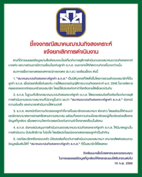 ธ.ก.ส.สุพรรณบุรี ขอยืนยันว่าสมาคมฌาปนกิจสงเคราะห์ลูกค้า ธ.ก.ส.จังหวัดสุพรรณบุรี ยังคงมีความเข้มแข็งและสามารถดำเนินงานได้ตามปกติ จึงขอแจ้งให้สมาชิกสมาคมฌาปนกิจสงเคราะห์ลูกค้า ธ.ก.ส.จังหวัดสุพรรณบุรี ทุกรายทราบว่าสมาคมณาปนกิจสงเคราะห์ลูกค้า ธ.ก.ส.จังหวัดสุพรรณบุรี ไม่ได้ยุติการดำเนินงาน (ไม่ได้ยุบ) ตามที่มีการเผยแพร่ข้อมูลผ่านสื่อสังคมออนไลน์ หากสมาชิกหรือครอบครัวของสมาชิกฯ มีข้อสงสัยเกี่ยวกับการดำเนินงานของสมาคมฌาปนกิจสงเคราะห์ลูกค้า ธ.ก.ส.จังหวัดสุพรรณบุรี สามารถติดต่อสอบถาม ข้อมูลเพิ่มเติมได้ที่ “สมาคมฌาปนกิจสงเคราะห์ลูกค้า ธ.ก.ส.” ที่เป็นสมาชิกได้โดยตรง