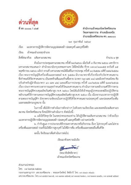เจ้าคณะจังหวัดศรีสะเกษ ลงนามคำสั่งด่วนที่สุด ถึงเจ้าคณะอำเภอ 22 อำเภอ เข้มงวดห้ามขาย-ดื่มแอลกอฮอล์ สูบบุหรี่-บุหรี่ไฟฟ้า ในเขตวัดเด็ดขาด ฝ่าฝืนมีโทษตามกฎหมาย