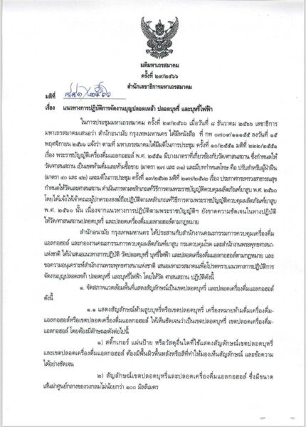 ในการนี้ เพื่อให้การดำเนินการดังกล่าวฯ เป็นไปด้วยความเรียบร้อย และสอดคล้องมติมหาเถรสมาคม จ.ศรีสะเกษ จึงขอให้เจ้าคณะอำเภอทุกอำเภอ ดำเนินการดังต่อไปนี้ 1. แจ้งให้วัดทุกวัด ในเขตปกครอง ได้ปฏิบัติตามมติมหาเถรสมาคม ว่าด้วยเรื่องแนวทางการปฏิบัติการจัดงานบุญปลอดเหล้า ปลอดบุหรี่ และบุหรี่ไฟฟ้า อย่างเคร่งครัด 2. กำกับดูแล การประกอบพิธีกรรมทางศาสนาหรือกิจกรรม อื่นๆ ไม่ขายบุหรี่ และไม่ขายเครื่องดื่มแอลกอฮอล์ รวมทั้งไม่ให้มีการสูบบุหรี่ ไม่ให้มีการดื่ม เครื่องดื่มแอลกอฮอล์ในพื้นที่วัด ทั้งนี้ตั้งแต่บัดนี้เป็นต้นไป.
