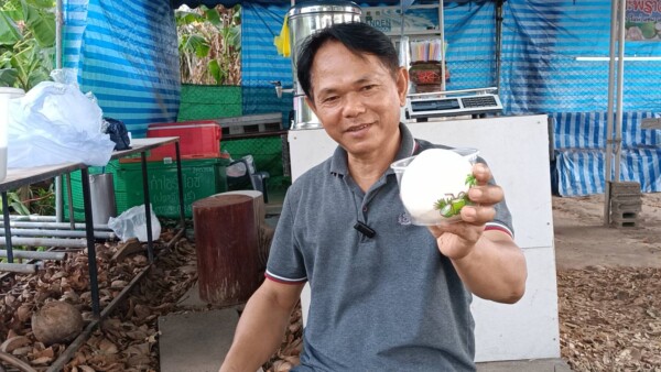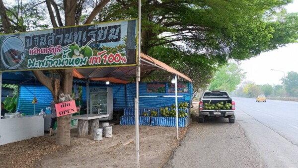 นายสุนทร พรมบุตร อายุ 51 ปี เจ้าของสวนมะพร้าวน้ำหอมบ้านสวนทุเรียน เปิดเผยว่า ปลูกมะพร้าวน้ำหอม 500 ต้นบนเนื้อที่ 15 ไร่ เมื่อก่อนมีพ่อค้ามารับซื้อถึงสวนมีเฉลี่ยรายได้ปีละเกือบแสนบาท โดยขายมะพร้าวน้ำหอมมานาน10ปี ปีนี้ยอมรับว่าราคามะพร้าวน้ำหอมตกต่ำเหลือลูกละ 2 บาท พ่อค้าแทบจะไม่มารับซื้อด้วยซ้ำ เมื่อก่อนมีพ่อค้ามารับซื้อถึงสวนลูกละ 5-10 บาท ไซส์เล็ก-ไซส์ใหญ่ จึงต้องพลิกวิกฤตให้เป็นโอกาส นำมะพร้าวน้ำหอมจากสวนมาแปรรูปขายสดๆริมถนน เช่น น้ำมะพร้าวสดแช่เย็น กะทิมะพร้าวสด วูดดิ้งมะพร้าวสด และมะพร้าวถอดเสื้อ