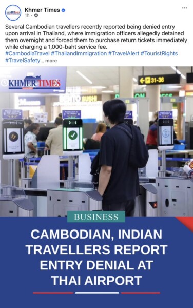 จากกรณีสื่อ Khmer Times ซึ่งเป็นเพจของกัมพูชา เผยแพร่ข่าวเป็นภาษาอังกฤษกล่าวอ้างว่า นักท่องเที่ยวชาวกัมพูชาและชาวอินเดียถูกปฏิเสธการเข้าเมืองที่ท่าอากาศยานในประเทศไทย แถมถูกบังคับให้จองตั๋วกลับโดยด่วน พร้อมถูกเรียกเก็บค่าบริการ 1,000 บาท จนสร้างความเข้าใจผิดต่อนักท่องเที่ยวต่างชาติที่เข้ามาเที่ยวประเทศไทย นั้น