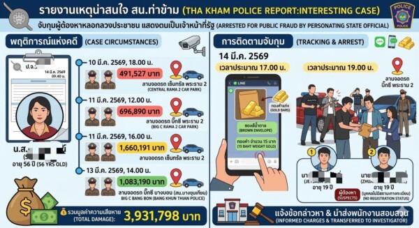 เมื่อวันที่ 14 มีนาคม 2569 เวลา 19.00 น. เจ้าหน้าที่ฝ่ายสืบสวนสถานีตำรวจนครบาลท่าข้าม สามารถจับกุมผู้ต้องหาได้ 2 ราย หลังร่วมกันก่อเหตุหลอกลวงประชาชนโดยแอบอ้างตนเป็นเจ้าหน้าที่ของรัฐ สร้างความเสียหายแก่ผู้เสียหายรวมเกือบ 4 ล้านบาท