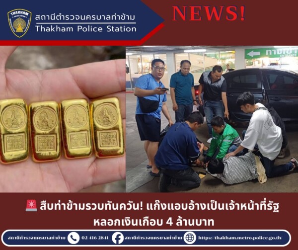 เมื่อวันที่ 14 มีนาคม 2569 เวลา 19.00 น. เจ้าหน้าที่ฝ่ายสืบสวนสถานีตำรวจนครบาลท่าข้าม สามารถจับกุมผู้ต้องหาได้ 2 ราย หลังร่วมกันก่อเหตุหลอกลวงประชาชนโดยแอบอ้างตนเป็นเจ้าหน้าที่ของรัฐ สร้างความเสียหายแก่ผู้เสียหายรวมเกือบ 4 ล้านบาท